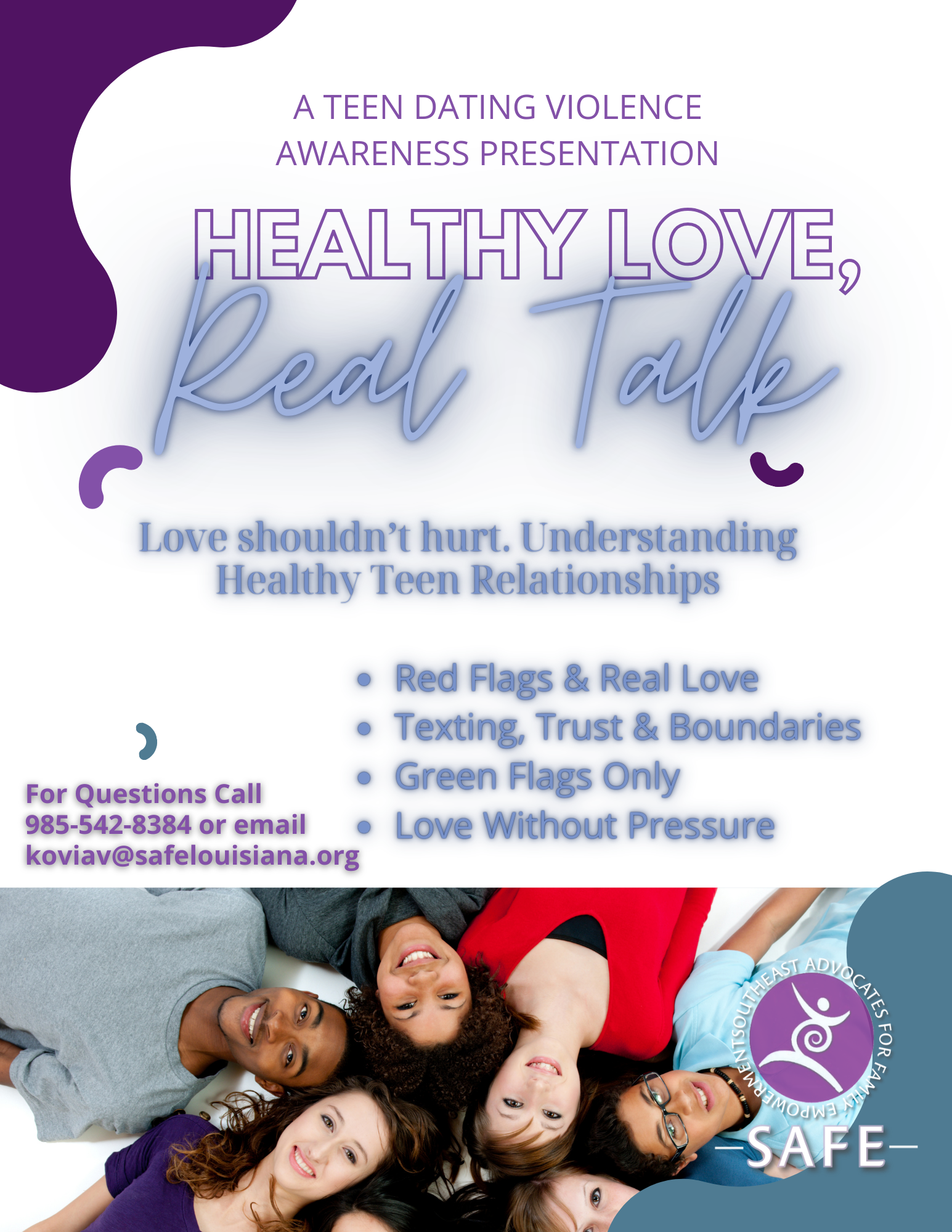 In honor of Teen Dating Violence Awareness Month, SAFE is hosting an interactive presentation designed for teens, parents, and community mentors in Tangipahoa, Livingston, and St. Helena Parishes.